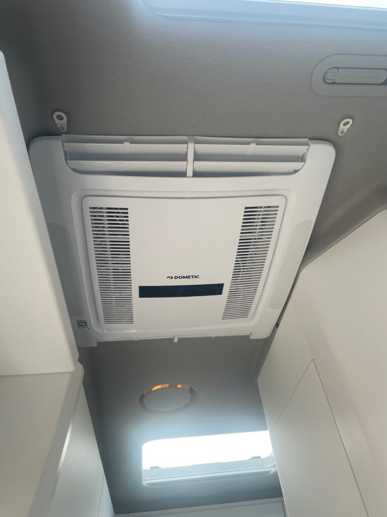 We installed a Dometic Fresh Jet FJX7 inverter compressor air conditioning system. This unit can be run off grid for up to 12 hours off the battery.