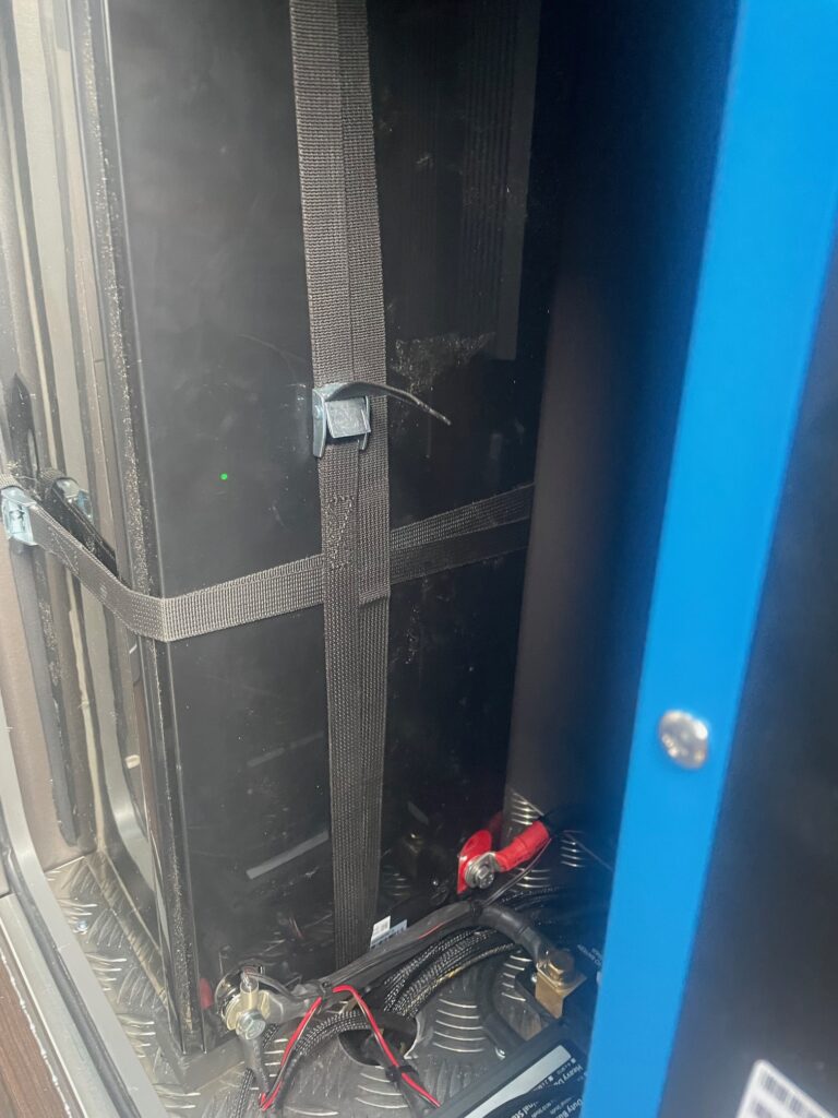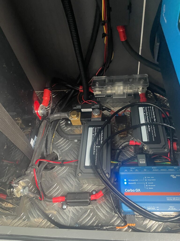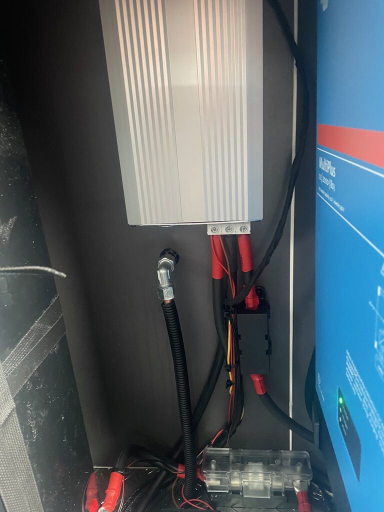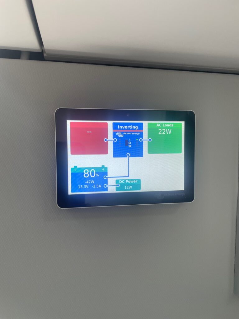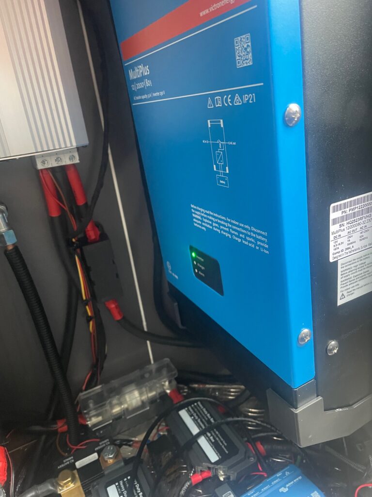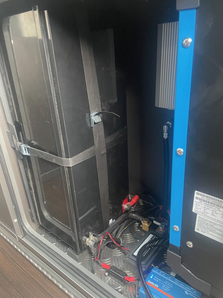 The gas locker in a Grand California can repurposed to house the power management system if you install an under slung gas tank. By repurposing the old gas locker we were able to install a 628AH lithium battery, a 2kva Victron Multi, and a 90 amp split charge upgrade. This was all controlled by a Victron GX system with a 5” display.